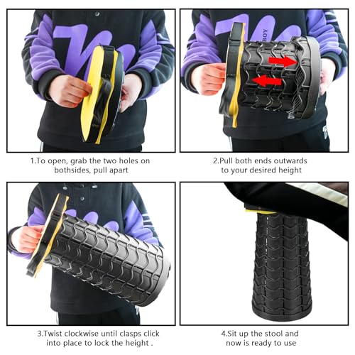 Auto-locking and Lightweight – This retractable stool is auto-locked when closed, can easily fit into your backpack, or carry by hand or on your shoulder, thanks to the adjustable nylon strap