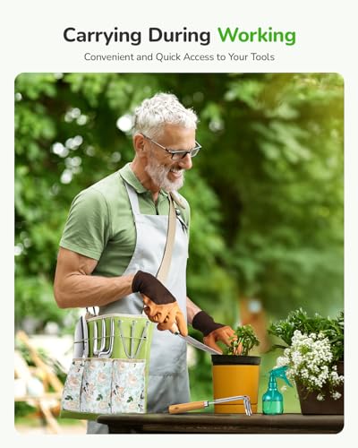 All-in-One Garden Tool Set, 11-Piece Heavy Duty Gardening Tools with Ergonomic Canvas Shoulder Crossbody Bag, Rust-Proof Premium Garden Tool Kit, Gardening Gift for Women Men, Green, GR003
