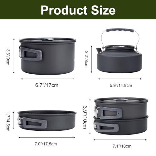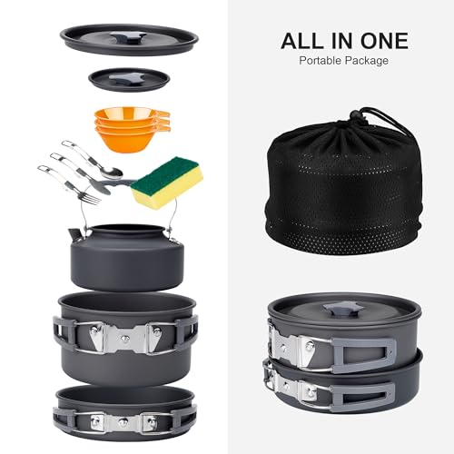 Perfect For your Family: This comprehensive camping cooking set includes a 1.7 liters camping pot equipped with lids, a 1 liters camping kettle, a 7 inches frying pan, a set of stainless tableware, 3 PP bowls and a cleaning sponge.