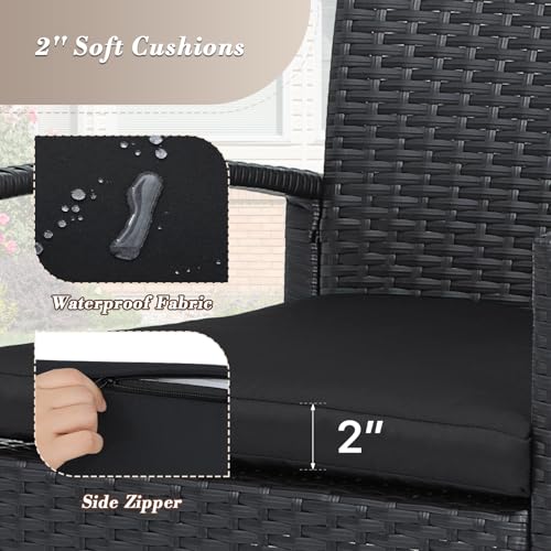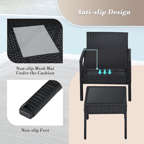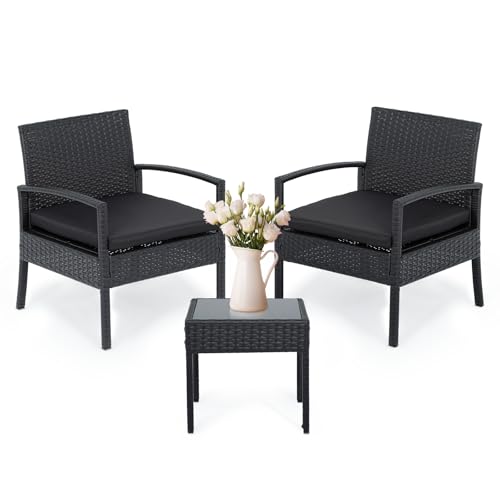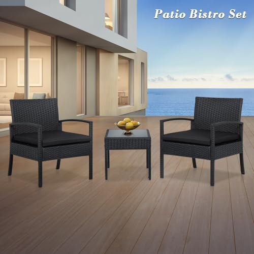 Athena Collection Patio Furniture Set PE Rattan Conversation Set of 3 Outdoor Bistro Table and Chairs Set with Seat Cushion for Garden, Front Porch, Backyard, Black