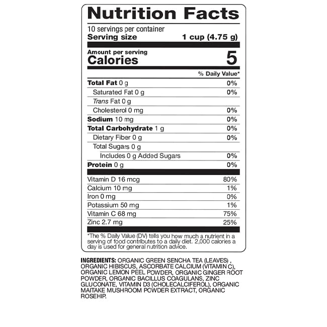 Daily Defense Tea: BareOrganicsingle-serve Daily Defense Tea withuperfoods is made with organic green tea leaves, probiotics &uperfoods for immuneystemupport, including hibiscus, ginger root, lemon peel, maitake mushrooms, rosehip, zinc, & vitamin C & D.