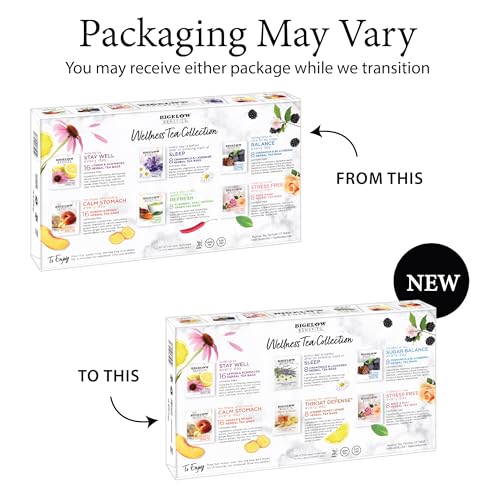 Wellness Tea Collection Gift Box Sampler:Includes 8 tea bags each of Stress Free, Balance, Sleep, Refresh or either Throat Defense and 16 tea bags each of Stay Well and Calm Stomach. Bigelow Benefits are everyday teas that fuel your body with good for you ingredients
