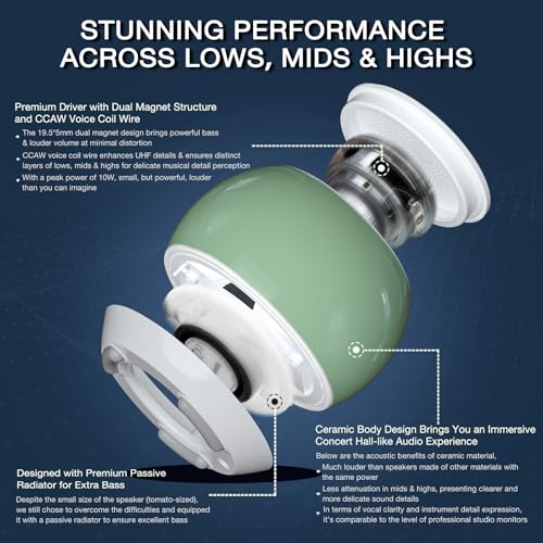 [Small,but Powerful, Louder than You Can Imagine] With a peak power of 10W, and enhanced by the use of ceramic material, it offers an expansive volume range. Despite its small size (like a tomato) , the volume is incredibly powerful, and the sound is always crystal clear even at maximum volume.