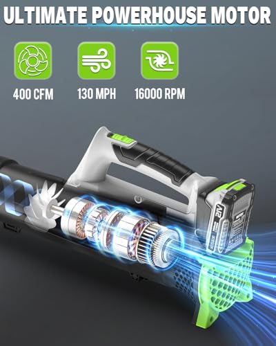 [New Upgraded Motor] The electric leaf blower cordless adopts advanced axial fan technology, with a speed of up to 16,000 RPM, providing 400 CFM air volume and 130 MPH wind speed, Ensuring efficient removal of leaves, outdoor dust, and small debris