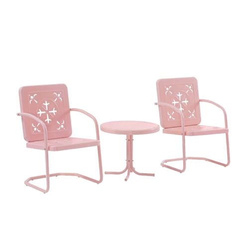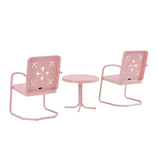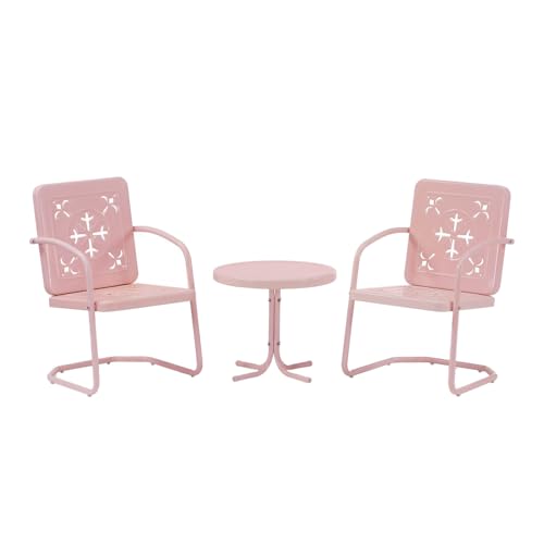 Crosley Furniture Azalea 3-Piece Vintage Outdoor Chair and Side Table Set, Retro Metal Patio Conversation Sets, Pastel Pink Gloss