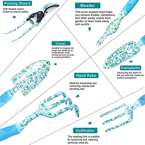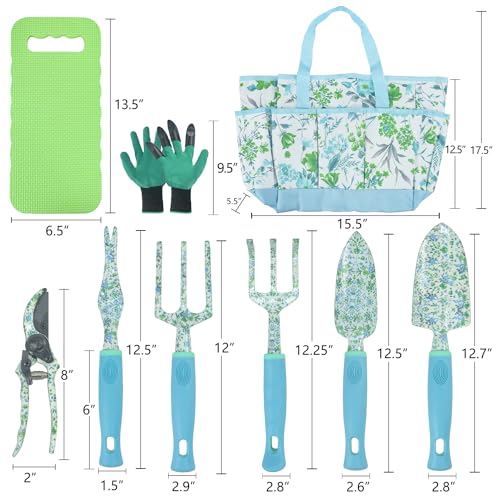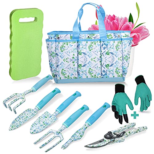 Garden Tool Set 9 Piece Aluminum Alloy Gardening Hand Tools Kit Gift for Women & Parent Gardening Supplies with Gloves,Tote,Kneeling Pad,Hand Pruner,Trowel,Hand Rake,Weeder,Fork,Transplanter