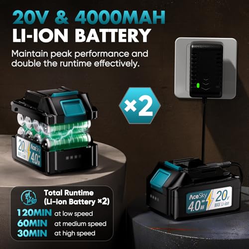 【2*4.0AH & 20V Lithium Batteries】Our cordless leaf blower is equipped with Dual 4.0AH lithium batteries, providing up to 120 minutes of runtime in low-speed mode and 30 minutes in high-speed mode. A convenient battery indicator (25%-50%-75%-100%) lets you monitor remaining power and charging progress with ease. Plus, the built-in protection system automatically shuts off the motor and battery, extending their lifespan and ensuring safe, continuous performance for all your outdoor cleaning needs