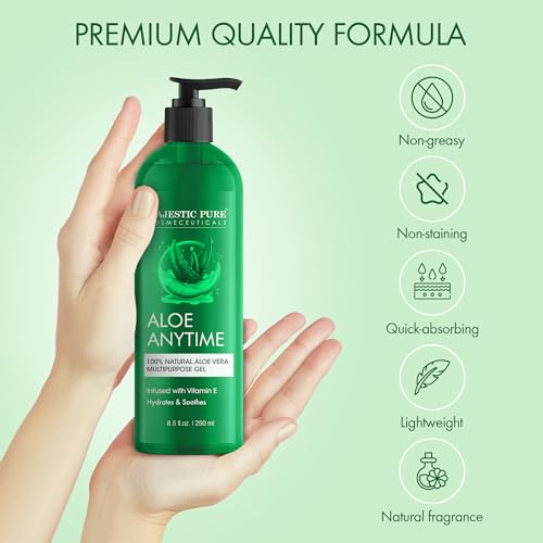 Soothes & Calms Skin: Majestic Pure Aloe Anytime Gel contains 100% Aloe Vera to help relieve irritated skin and soothe sunburn, rashes, and minor burns. Its cooling properties calm redness and discomfort, leaving skin feeling refreshed and hydrated.