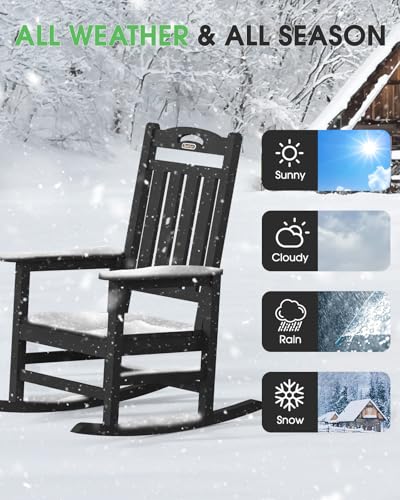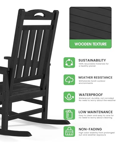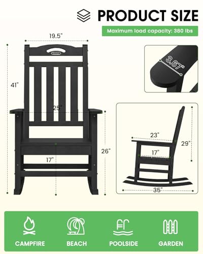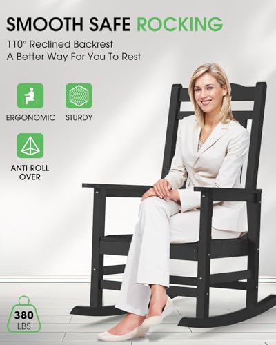 Oversized Outdoor Rocking Chair, High Back Porch Rocker Chair, HDPE All Weather Resistant Rocking Chairs for Patio, 380lbs Weight Capacity, Black