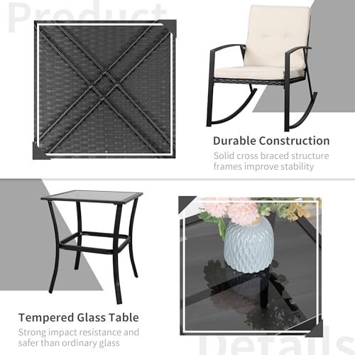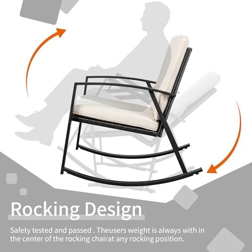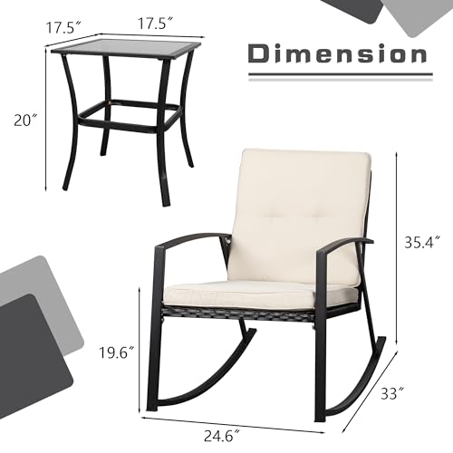 Shintenchi 3 Pieces Rocking Bistro Set Wicker Patio Outdoor Furniture, 2 Rattan Porch Chairs Conversation Sets with Glass Coffee Table (Beige)