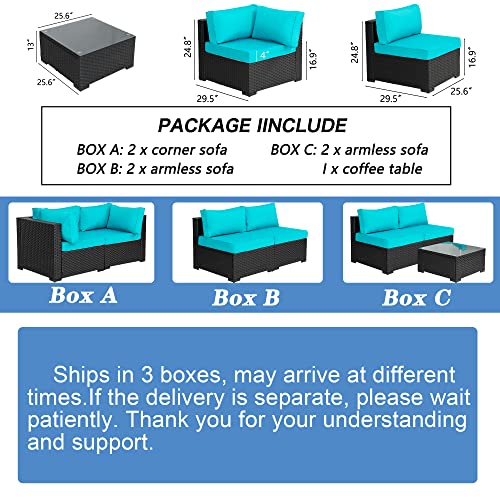 Shintenchi 7 Pieces Outdoor Patio Sectional Sofa Couch, Black PE Wicker Furniture Conversation Sets with Washable Cushions & Glass Coffee Table for Garden, Poolside, Backyard (Blue)