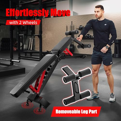 Easy to Assemble, and Space-Saving: Designed for convenience, the bench features 2 wheels for easy movement around your home gym. Assembly is quick and hassle-free, with all parts and tools included. When not in use, it folds compactly for storage, making it ideal for home gyms, garages, or small spaces.