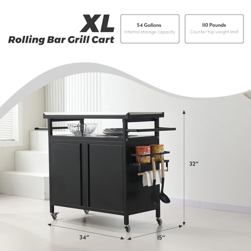 XL Rolling Bar Grill Cart Outdoor Patio Furniture, Outdoor Grill Table with Stainless Steel Top for Kitchen Prep and Outdoor Storage Cabinet for Grilling Accessories, Black