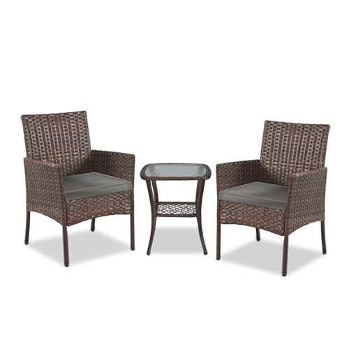 YIYAN Garden Furniture Set 3 Pieces Patio Rattan Wicker Chairs,Patio Porch Outdoor Furniture Set with Chairs, Coffee Table and Washable Cushions (Gray)
