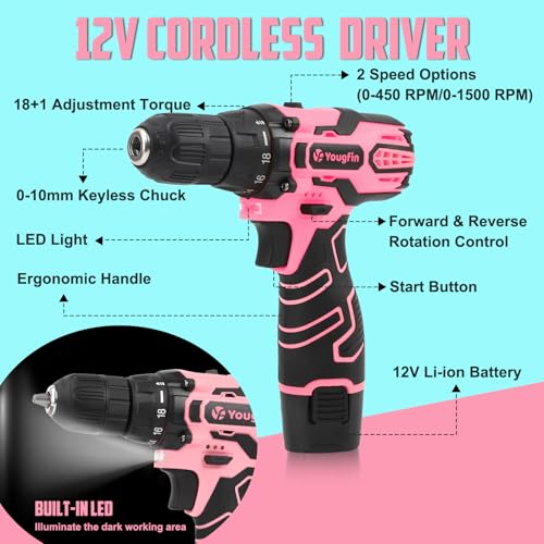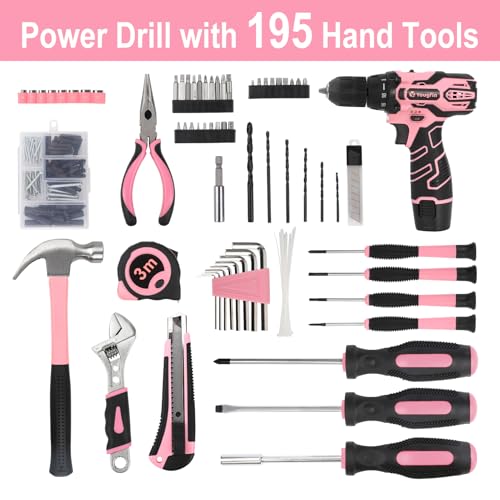 YOUGFIN Pink Drill Set for Women, Tool Kit with Drill 12V or Home Office Repairing & Improvement, Household Drill Set Power Tool with Pink Tool Box 195 Pieces